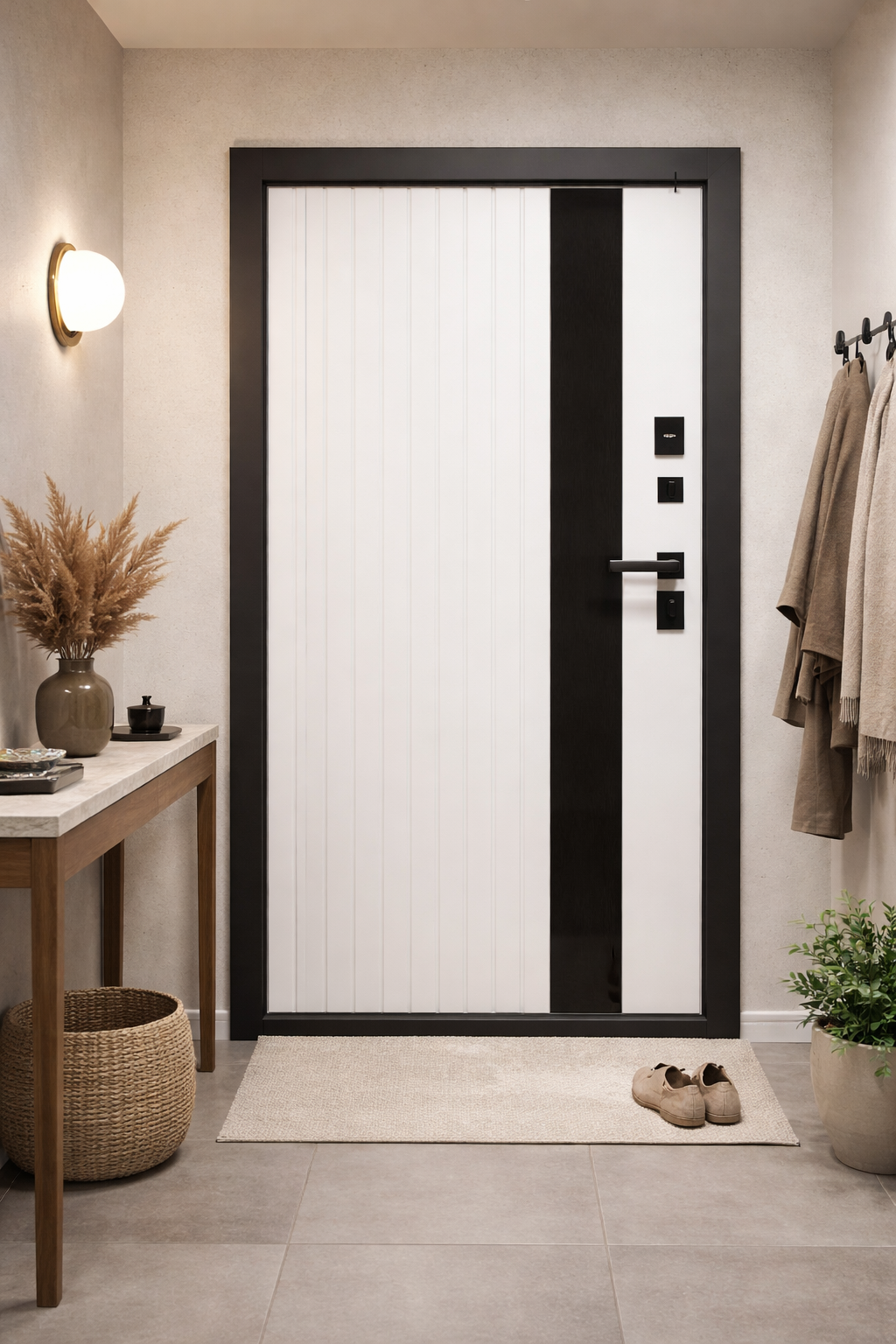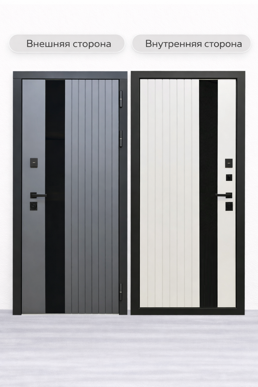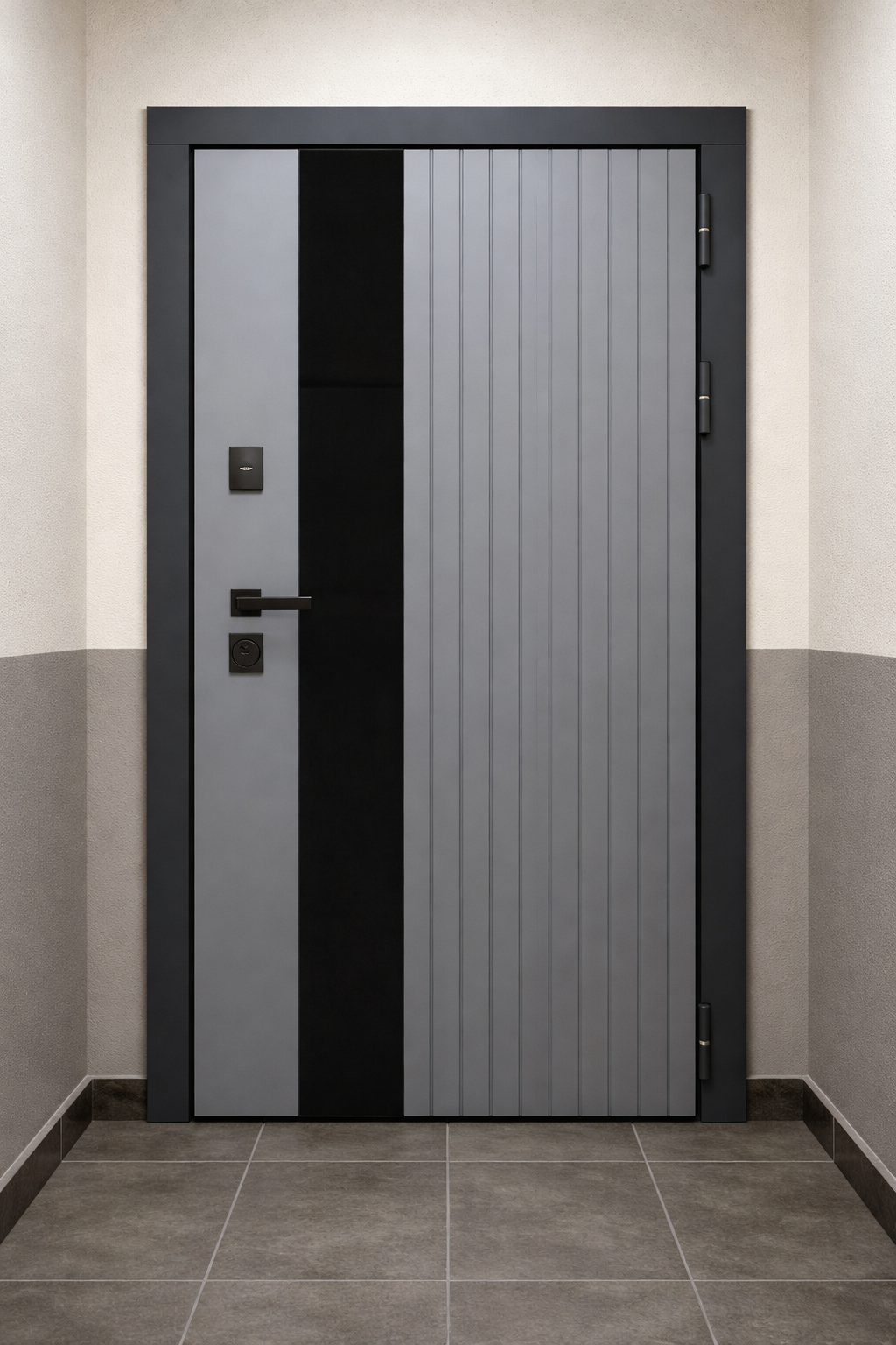 Отделка снаружи: лист стали + ламинированная МДФ панель 10мм , цвет Графит Нубук, наличник Антрацит софт + вставка черный лакобель