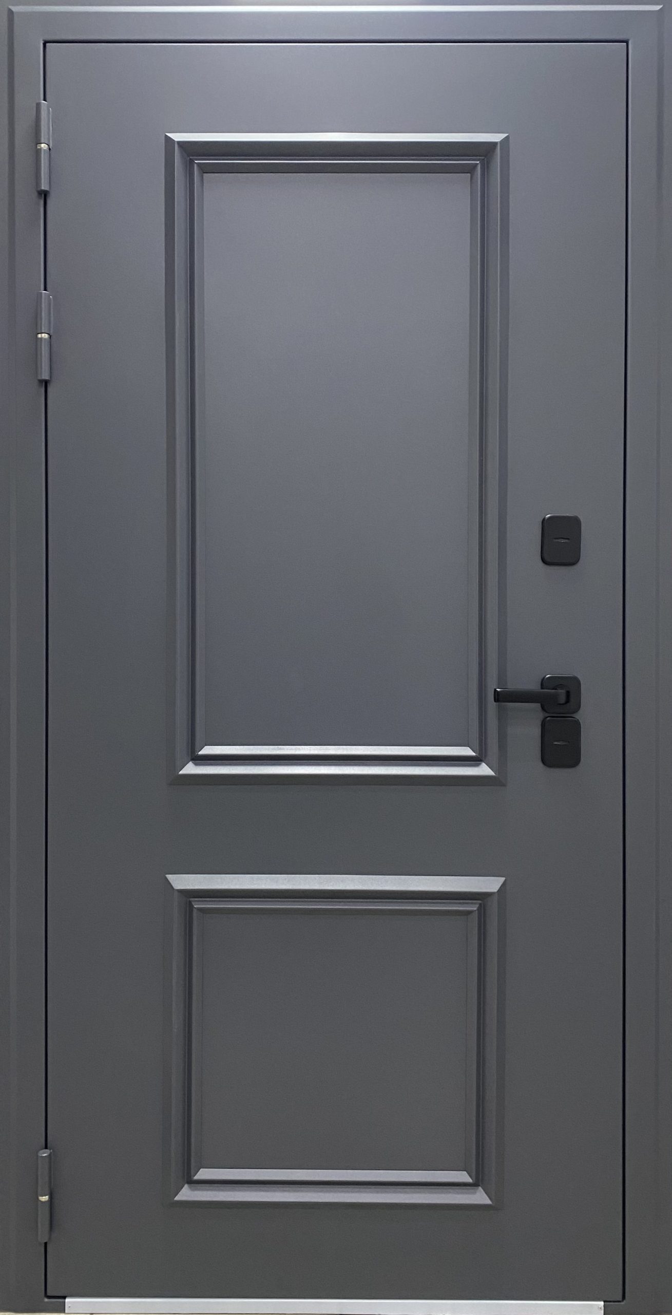 Отделка снаружи: лист стали + накладной багет цвет Муар серый RAL 7024