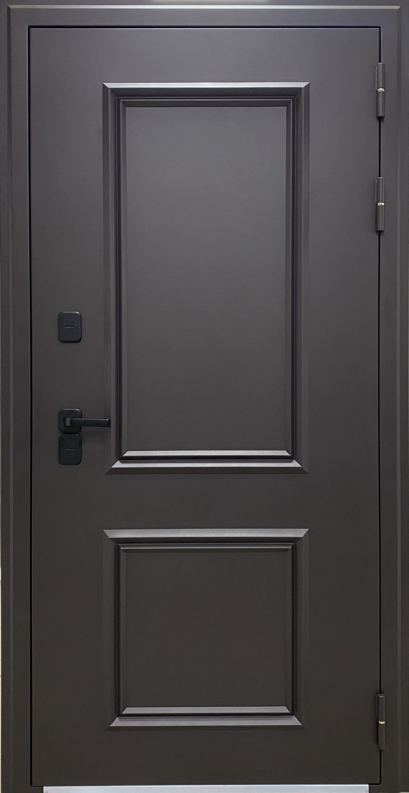 Отделка снаружи: лист стали + накладной багет цвет Муар коричневый RAL 8019